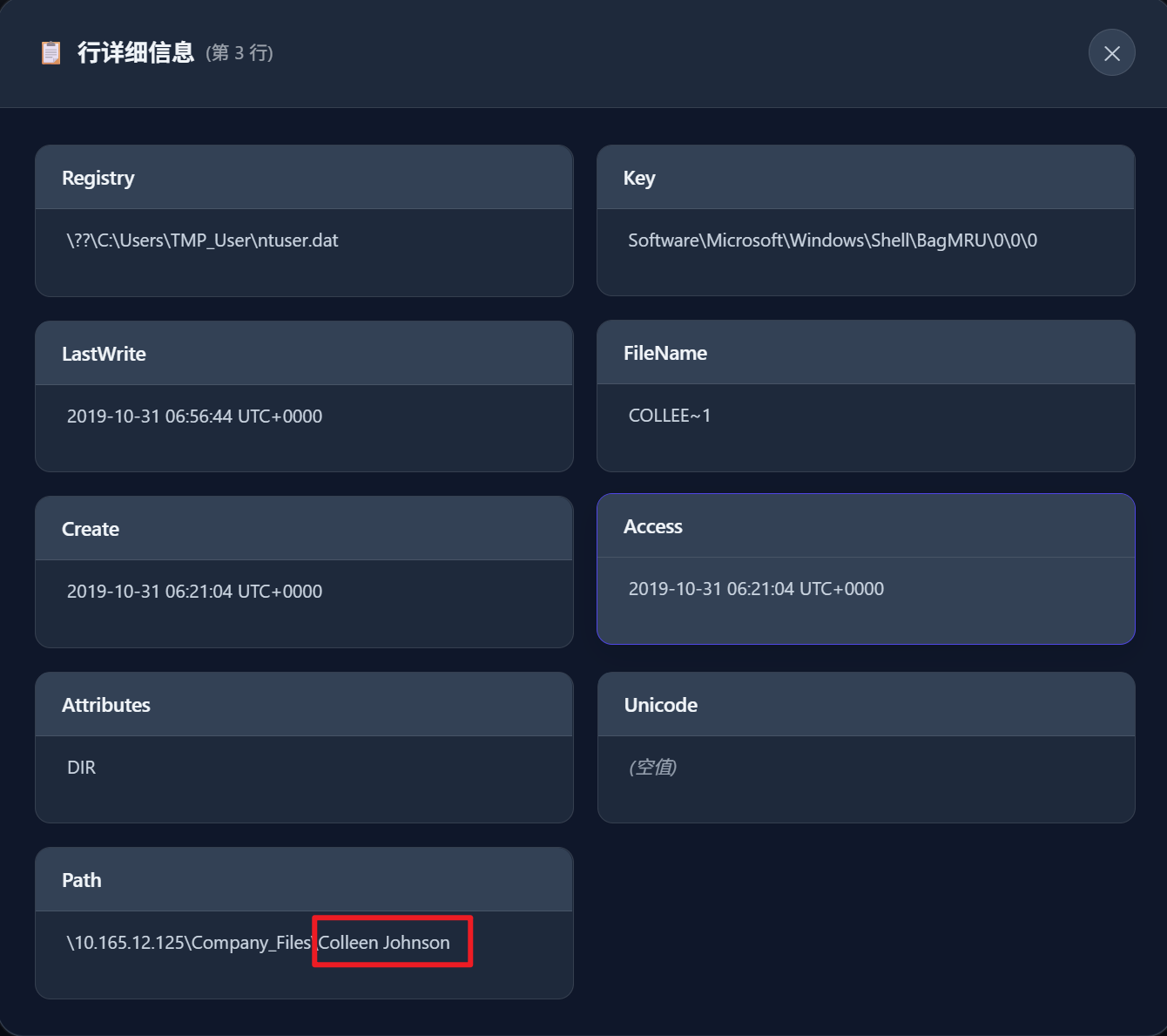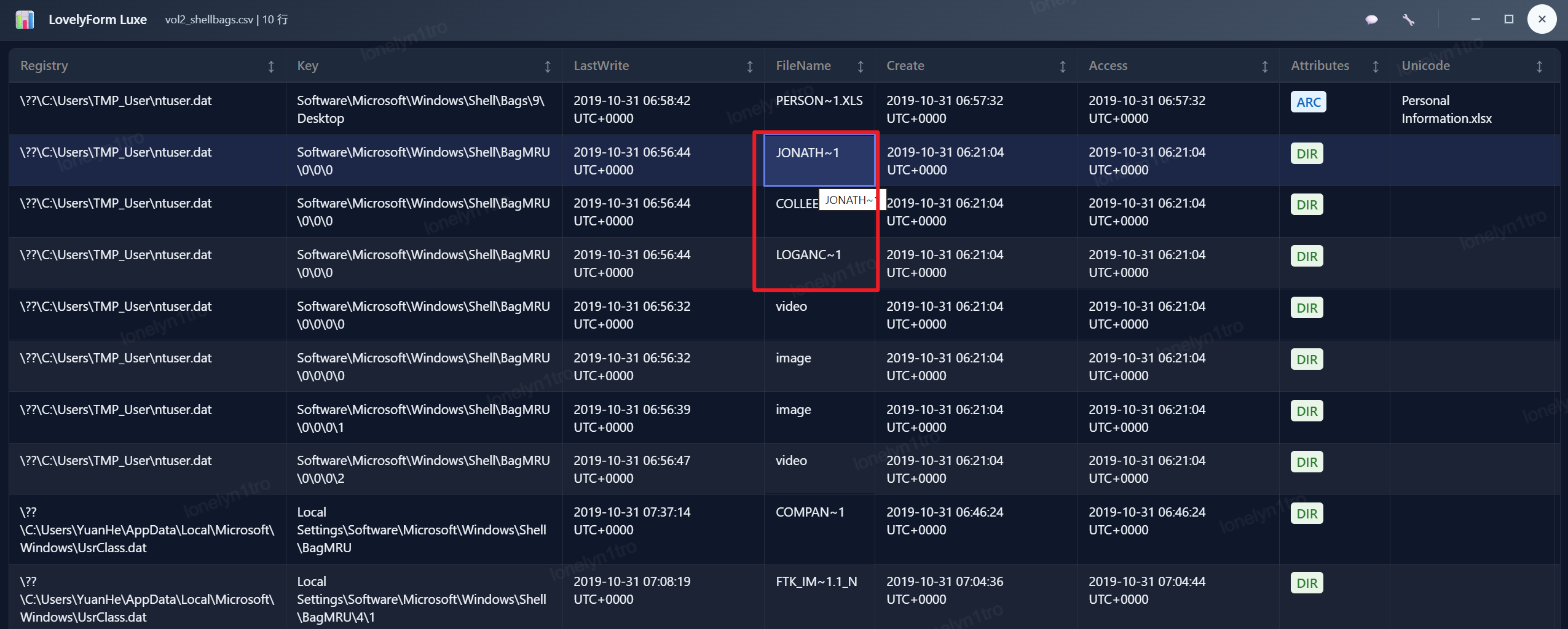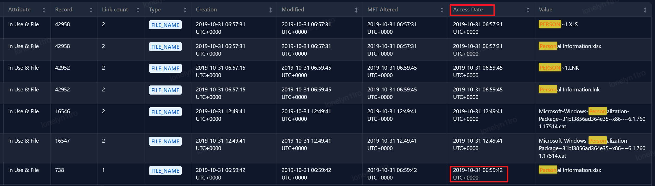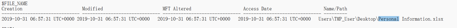使用mftparser将ntfs文件系统文件表解析出来,搜索personalinfomation.xlsx,可以看到访问时间为2019-10-31 06:59:45