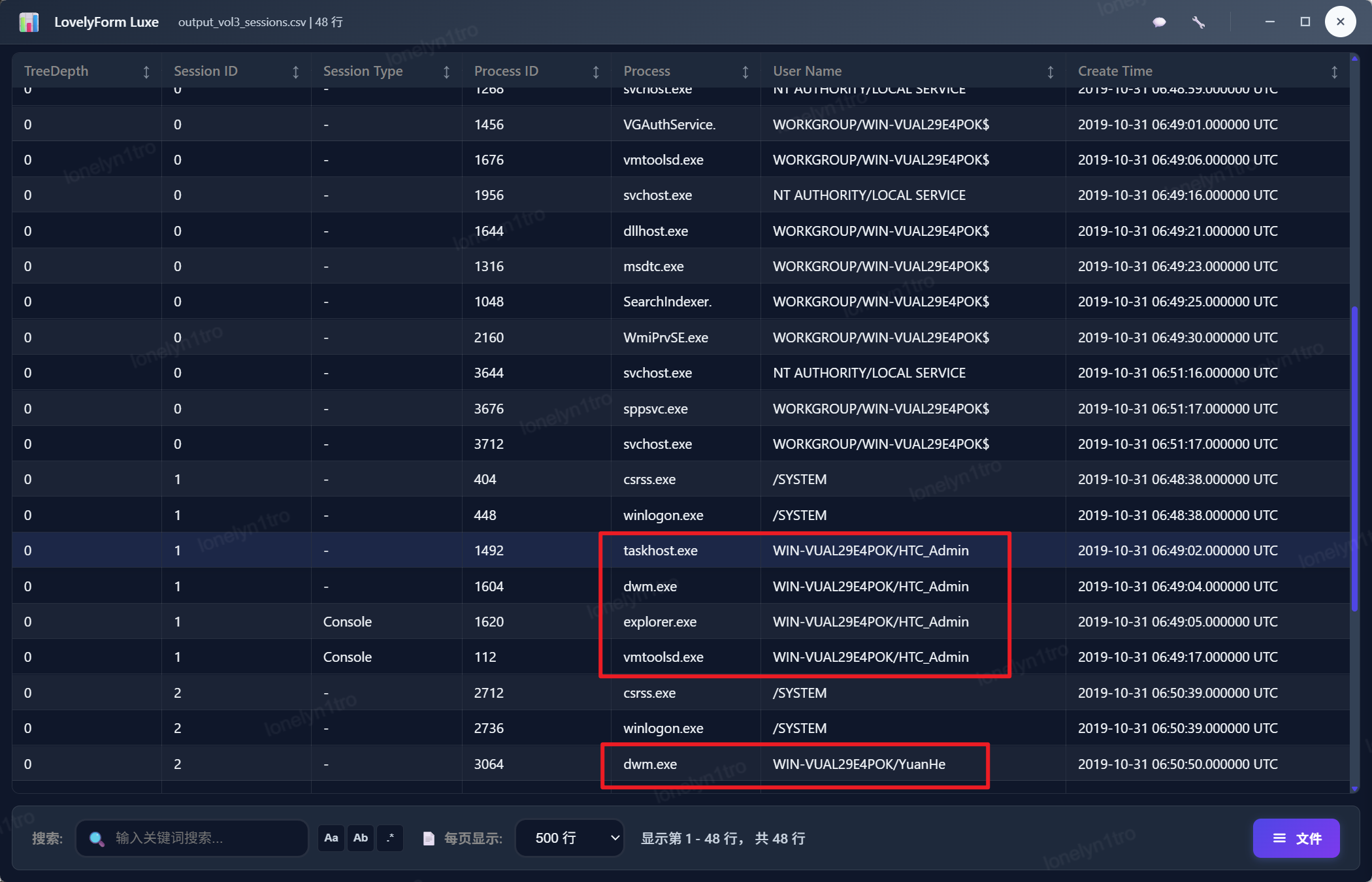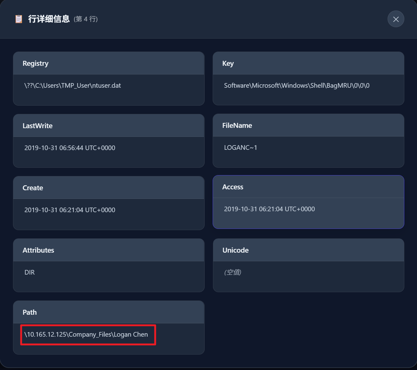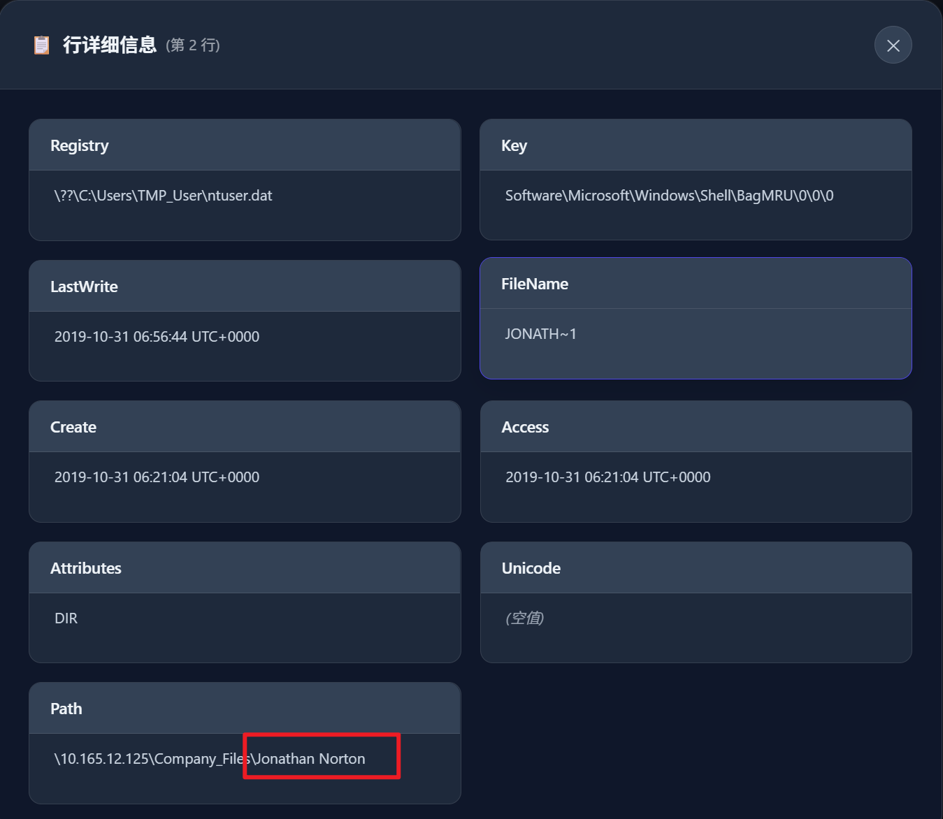 使用mftparser将ntfs文件系统文件表解析出来,搜索personalinfomation.xlsx,可以看到访问时间为2019-10-31 06:59:45