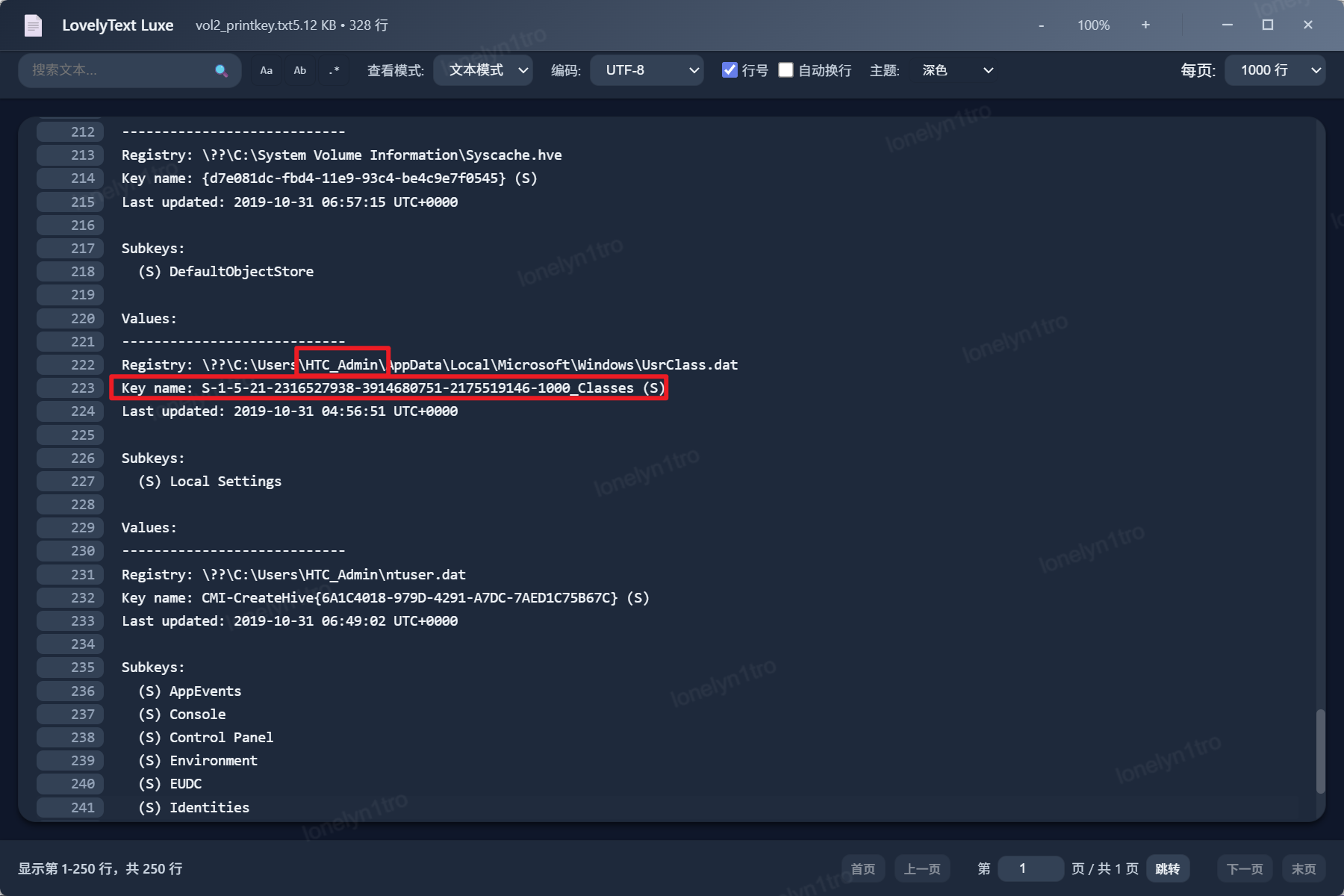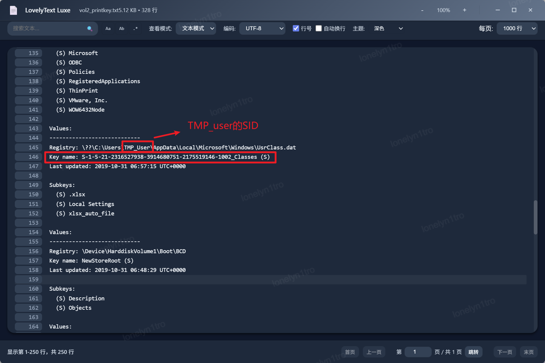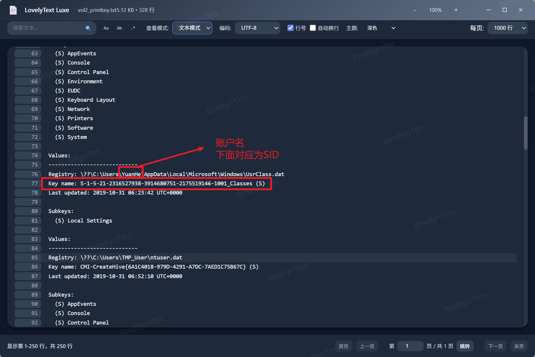 使用printkey命令将该内存镜像中的注册表项打印出来,找到用户相关的表项信息,对照sid发现B为正确的用户SID