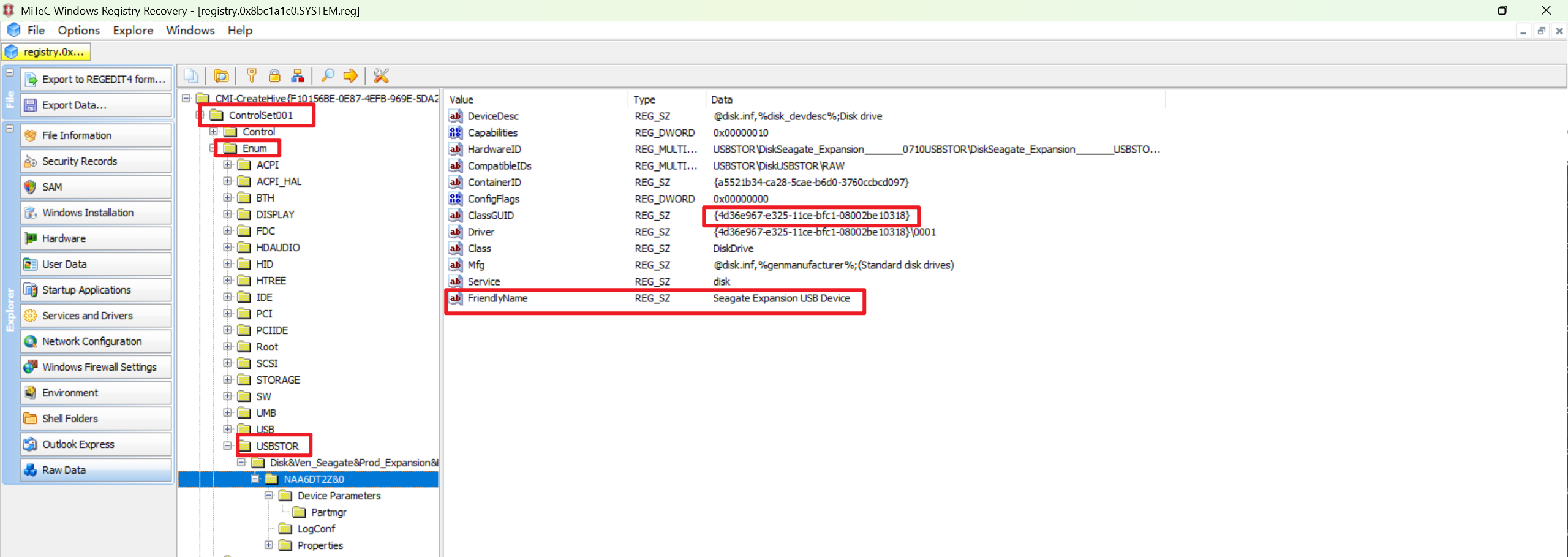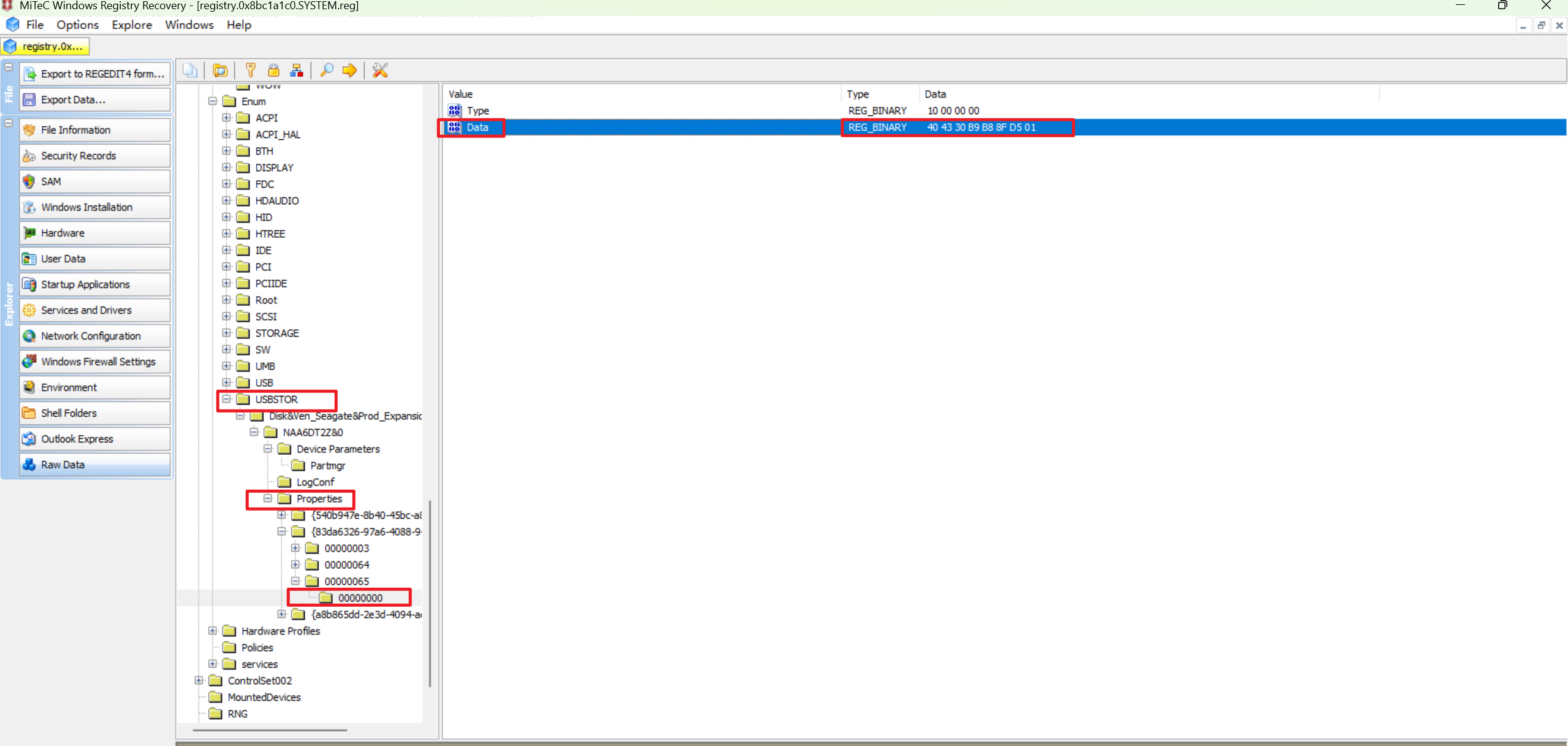 使用dumpregistry将注册表导出来查看,也可以效仿上面的方式用命令查,但是方便起见导出用WRR查看(注意直接转储出来的注册表文件无法用常用的注册表编辑器查看),查看导出的\REGISTRY\MACHINE\SYSTEM表项下的USBSTOER,可以看到存在连接的设备排除AB,可以看到设备不是huawei而是seagate排除C选项,guid不一致,排除D,可以确定是E正确。