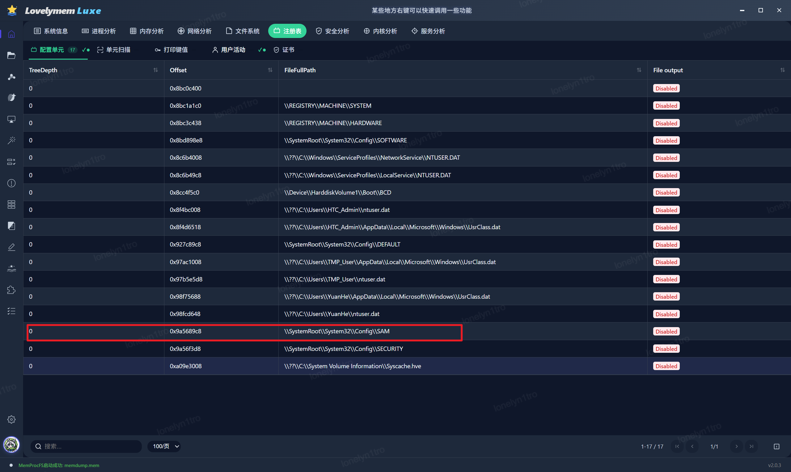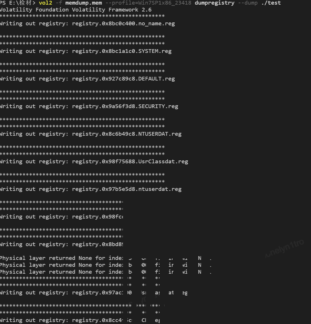 导出内存镜像所有的注册表