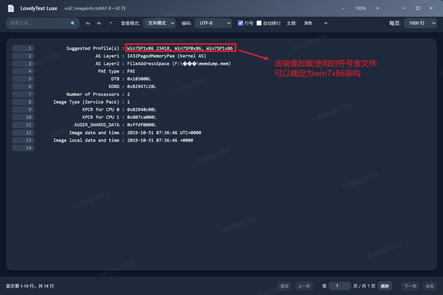 使用内存取证工具lovelymem加载内存镜像memdump.mem,分析结果可知该内存镜像使用的符号表是Window7 x86架构的,由此确定这是对应的的操作系统和硬件架构。