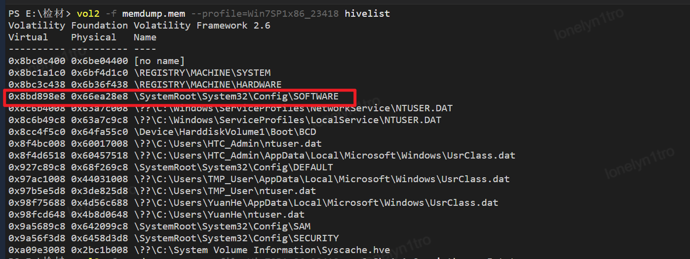 使用命令hivelist查看虚拟地址偏移,也可使用vol3对注册表进行分析,可得到偏移
