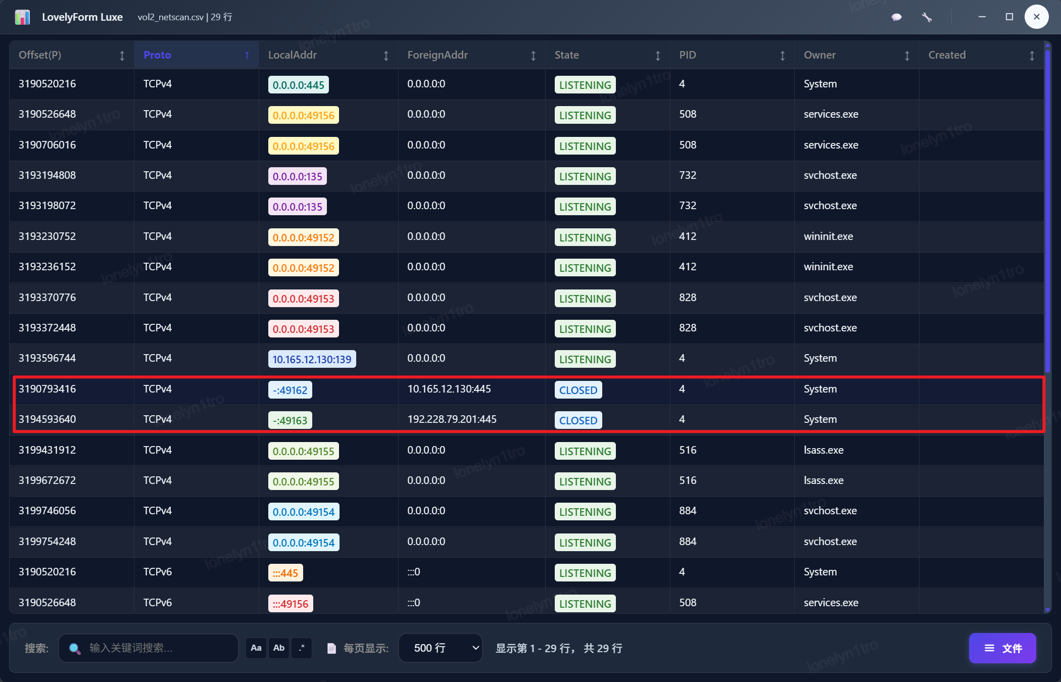 使用netscan后对tcp进行过滤,排序得到的结果