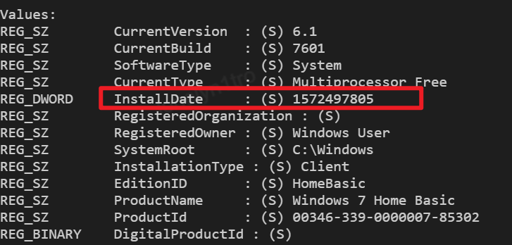 A选项,同样方式查看注册表项目,需要查的主键名为\SystemRoot\System32\Config\SOFTWARE,偏移为0x8bd898e8,键名路径为Microsoft\Windows NT\CurrentVersion,可以查到安装时间的时间戳,转换一下即可知道A不正确。