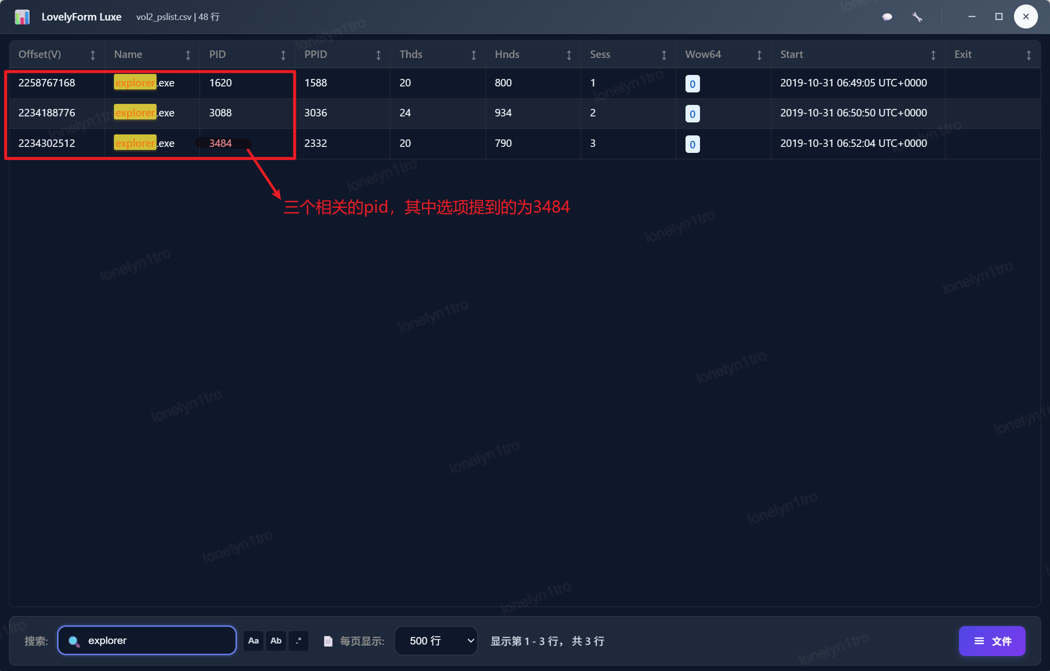 使用vol2的pslist查看对应进程信息,筛选explorer.exe,可得到三个相关的进程信息,其中题目选项提到的为3484
