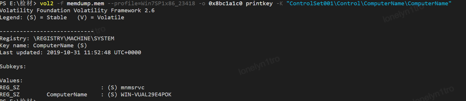 也可以通过上题中注册表hivelist的偏移查看对应的注册表项内容,查看电脑的名称,需要查看的注册表项为\REGISTRY\MACHINE\SYSTEM,使用的偏移为0x8bc1a1c0,查看对应表项内容,查询的键名路径为ControlSet001\Control\ComputerName\ComputerName